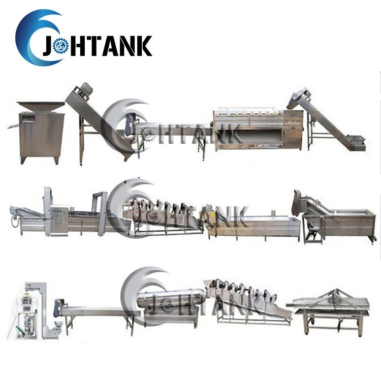1. Μηχανή → 2 ανελκυστήρων μεταφορέων. Μηχανή → 3 καθαρισμού και αποφλοίωσης. Μηχανή → 4 επιλογής. Τέμνουσα μηχανή → 5. Ανελκυστήρας κάδων νερού → 6. Πλυντήριο → 7. Ζεμάτισμα της μηχανής → 8. Δομένος μηχανή για να απομακρύνει το νερό → 9. Ηλεκτρικό ξηρότερο → 10. Συνεχής τηγανίζοντας μηχανή → 11. Η δόνηση αφαιρεί το λάδι τη μηχανή → 12. Ηλεκτρικό dryer⇒